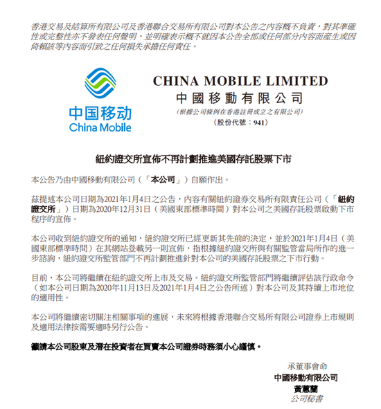 1月5日下午消息,中国移动发布公告称,目前,本公司将继续在纽约证交所上市及交易。纽约证交所监管部门将继续评估该行政命令(如本公司日期为2020年11月13日及2021年1月4日之公告所述)对本公司及其持续上市地位的适用性。本公司将继续密切关注相关事项的进展,未来将根据香港联合交易所有限公司证券上市规则及适用法律按需要适时另行公告。