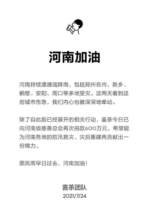 喜茶今日宣布追加600万元驰援河南。此前,喜茶已向郑州慈善总会捐款500万元用于防汛救灾。
