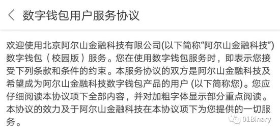 带着强烈的好奇心,零壹财经·Binary下载了“数字钱包校园版”应用,通过操作界面和服务协议深入地了解了一下这款应用。